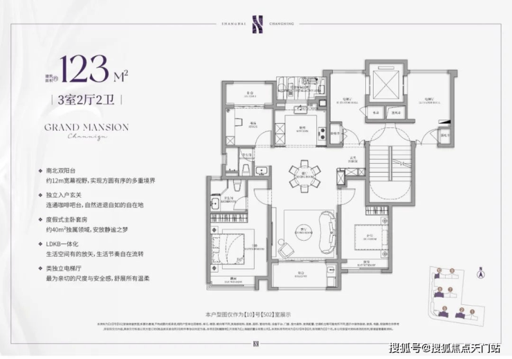 项目建面约120㎡户型是类独立电梯厅的设计,室内则是标准的南北通透+三开间朝南设计;主卧套房配置,自带卫生间,私密性和舒适度俱佳。