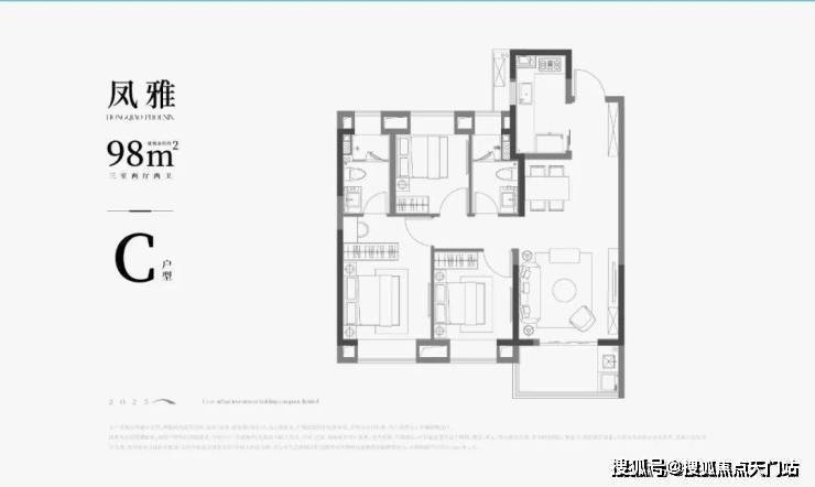 约99㎡户型是标准大三房设计售楼处电话:400-1182-105,实用性超强,满足二人世界到二胎时代的全周期居住需求,且 主卧做到了套房设计,满足未来高品质生活需求,且三卧室、两卫浴全部配置飘窗, 整体得房率和空间利用率更高,三开间朝南,保证了室内充足的采光和视野。