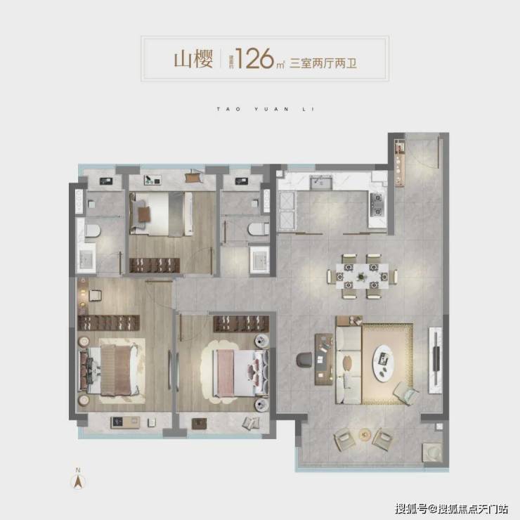 106㎡3房则做到“真三房”,不是市面的“2+1”,而是每个房间都能做卧室;约3.45米客厅面宽、开放式可视厨房、南向大阳台,让家庭公共活动空间更显开阔。
