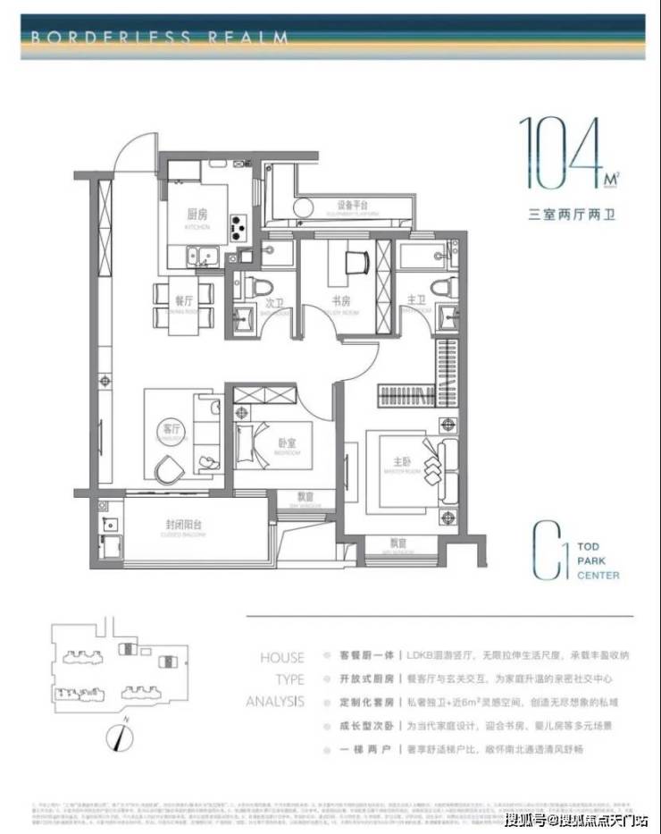 建面约104m²户型特点:LDKB洄游式竖厅+开放式厨房,生活尺度无限拉伸,主卧近6m²灵感空间,承载更多功能可能,成长型的次卧,书房儿童房随心所欲。