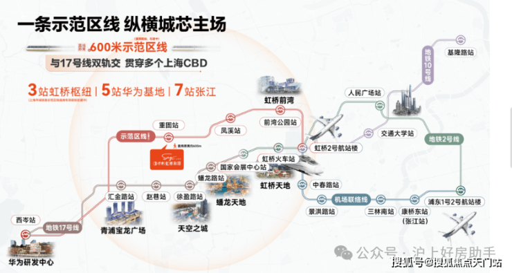 示范区沿线汇聚大量高能商业。2到到前湾芳乐路TOD,有开市客及前湾印象城(在建),3站到虹桥枢纽,则有虹桥天地及龙湖天街等。另外徐盈路天空之城、徐泾蟠龙天地、百老汇等也能快速抵达。