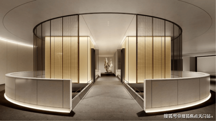 缦云上海一切美好由园区入户门头开始,延续缦系独有的美学艺术,缦云一期入户门头约32米宽、6.5米高,采用蓝翡翠奢石、百年黑松、古桩和丛生朴树,阔绰典雅。用艺术装点生活,甄选中国现代雕塑艺术家朱峰作品《无尽之环》,以简练的无限循环形态象征无尽与永恒,让人从外部嘈杂中的兴奋过渡到宁静状态,进入一种新的心境。