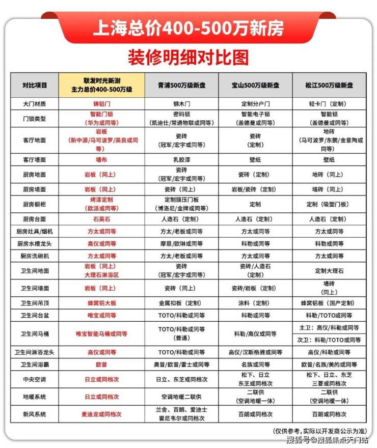 我把各区目前四百万比较热门的新房的装修标准做了横向对比:
