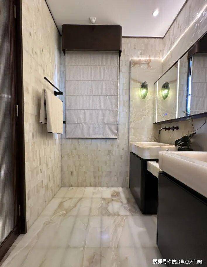 而样板间里这第二个卫浴空间,更接近于享受级。嵌入式浴缸,设计了魔镜系统,可以供业主泡澡时观影娱乐;除此之外,这个卫生间也有独立的淋浴房,并设计有桑拿房。