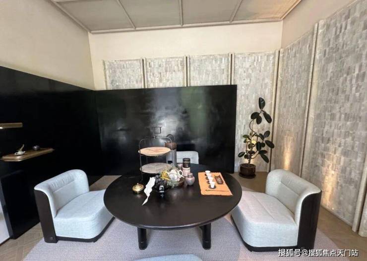 整体一层空间的东南方向,样板间设计为了茶室,配合西向落地玻璃窗,同样正对庭院。