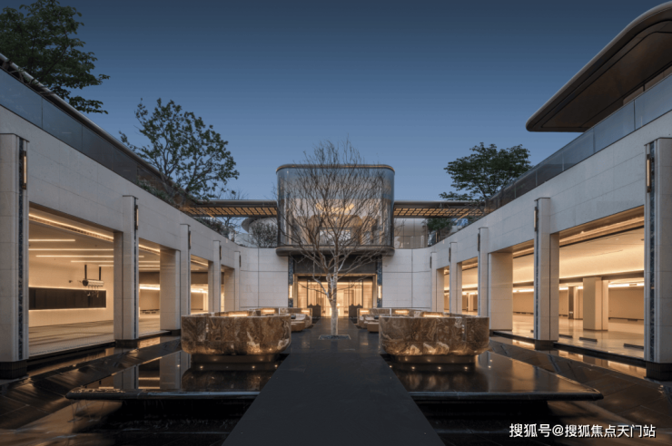 门庭外,两侧辅以具有仪式感的跳泉水景,将建筑的圆弧美感与自然水景相合,共同构成海上·清和玺“贵雅清和”的城市界面。