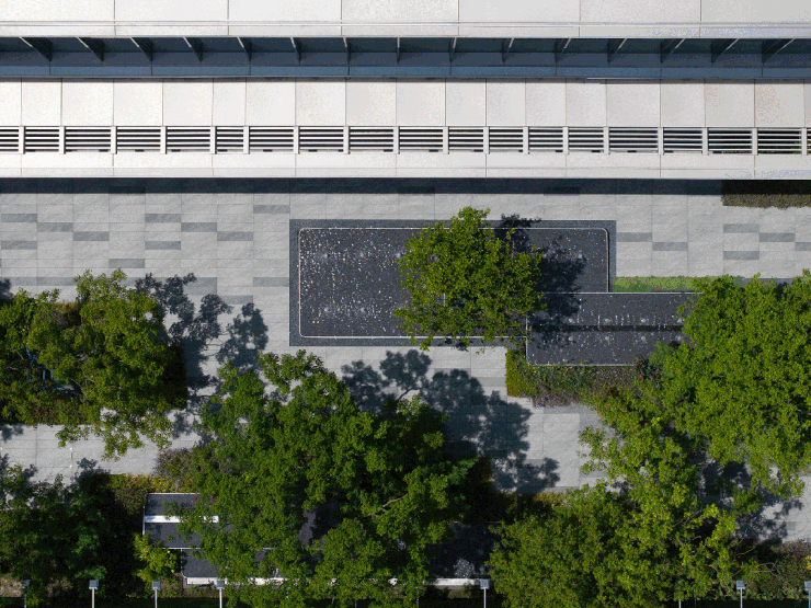 同时, 社区内部景观打造了大面积的叠级水景,搭配普拉达绿大理石和浪淘沙石材, 呈现整体空间的隐奢基调。