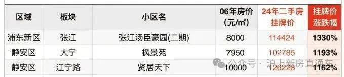小胖君之前也统计过上海近18年的房价变迁史,涨幅最高的是张江汤臣豪园,涨幅超过1300%,且张江整体涨幅都不错。