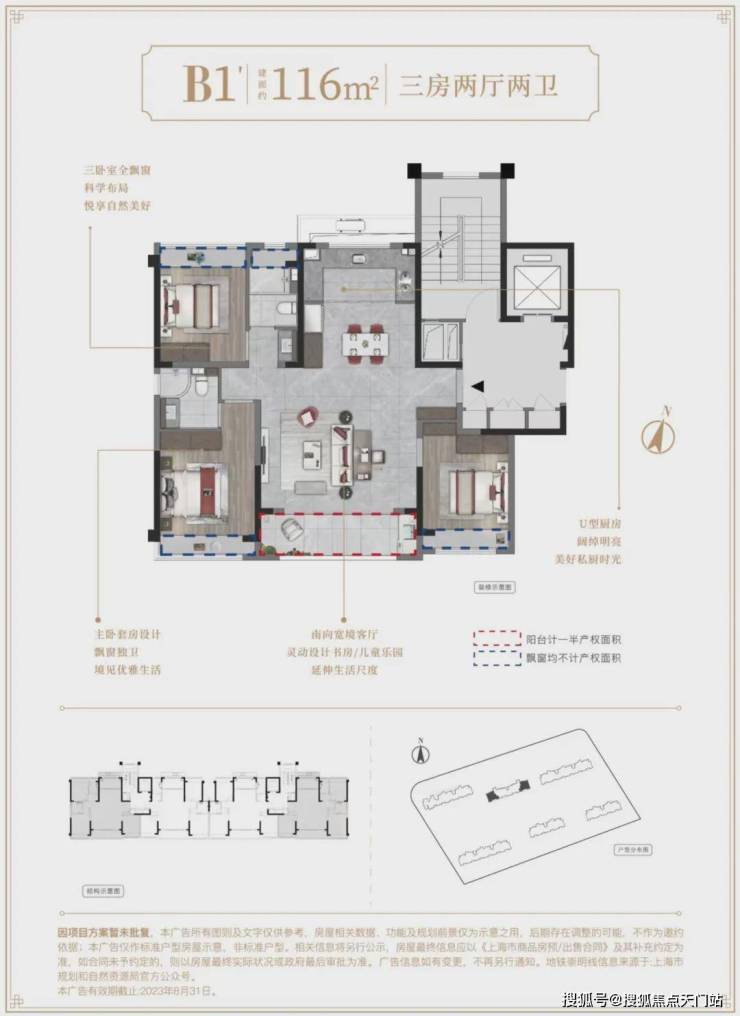 116m²户型特点:三卧室全飘窗,科学布局,悦享自然美好,南向宽境客厅,灵动设计书房/儿童乐园,延伸生活尺度,U型厨房,阔绰明亮,美好私厨时光,主卧套房设计,飘窗独卫,境见优雅生活。