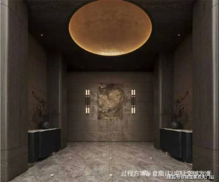 约50m面宽的气派门头+酒店式入户大堂: 打造艺术格调归家。入户大堂由吴滨设计,呈现“天圆地方”的效果,方正的线条勾勒出空间的规整与大气,与顶部的圆形形成刚柔并济的视觉平衡,让每一次归家都成为一场尊贵的礼遇。