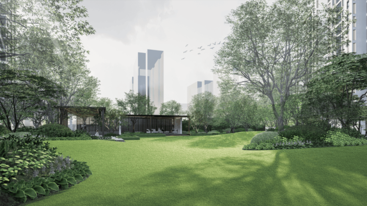 在中央景观上,做了 大面积的阳光草坪,配上会客廊架、游园小径、运动热身区、登高面外墙和下凹绿地,满满的大自然氛围感油然而生。
