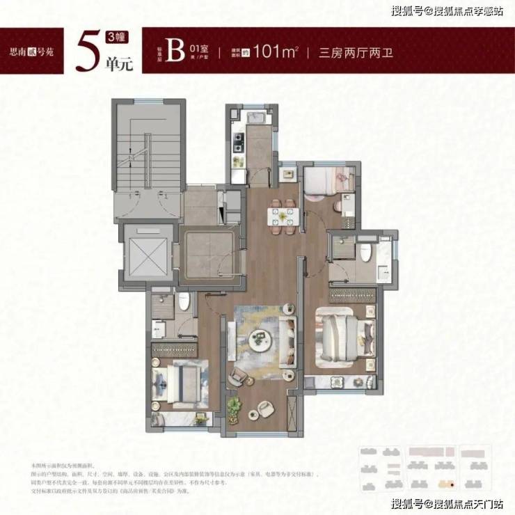 建面约100-101㎡户型, 拥类独立电梯厅,无连廊+飞机户型南北通透