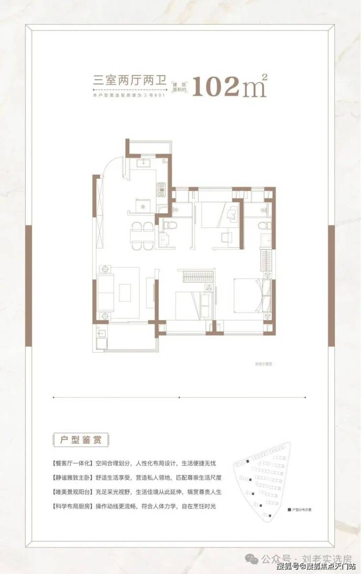 建面约102㎡3房2厅2卫户型,做到了三开间朝南+双朝南卧室带飘窗+动静分离+卫生间干湿分离,采光面拉到极致!是一个非常方正的户型。