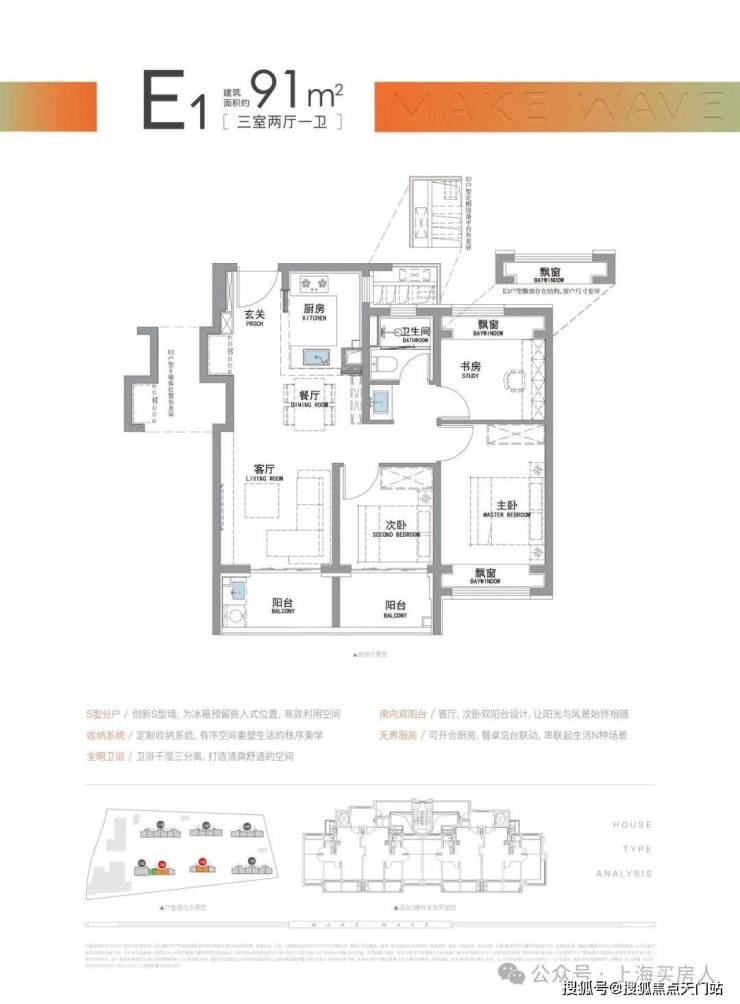 而招商·时代潮派|东屿此次建面约91㎡户型,就做出来了比市面百平户型更好的的“ 南向双阳台+南北双飘窗” 设计。