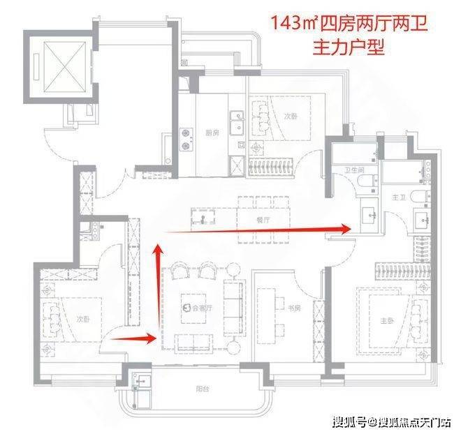 120平及以上建面的都是较为方正的飞机户型。其中,120平的户型都分布在小区西南侧的洋房中,顶楼赠送大露台;该栋楼在规划图中标有采光井,一层或有下跃产品,据说地下室可以自己隔成两层。143平的主力户型,次卫与主卫紧靠,南向次卧门紧靠阳台,需穿过客厅和餐厅才能到达次卫,动线较长。