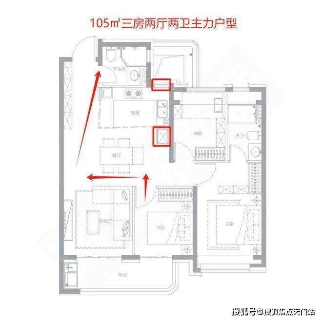 105平的主力户型,布局方正,但大门边就是客卫。若次卧的人想上厕所,需要穿过餐厅/客厅和厨房,动线较长,要么去主卧卫生间,这对于半夜想上厕所的人不太友好。厨房仅有一个小窗对着设备平台,这样的设计会影响采光;进深约1.8米,面宽约3.1米,整体利用空间较小,冰箱也被挪出了