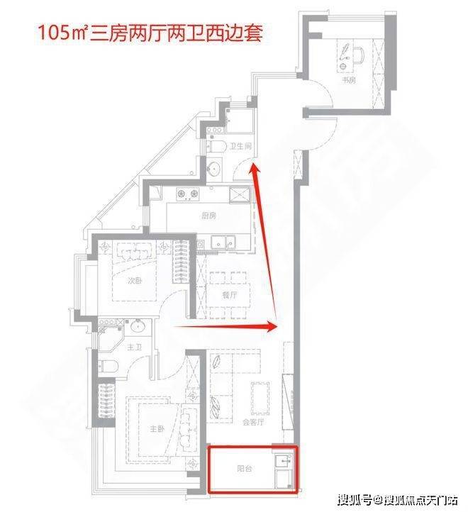 105平的西户边套,户型整体狭长,东北角有一个孤零零的书房,从阳台南侧到书房,大约有13米。与105平的主力户型一样,进门就是卫生间,次卧去卫生间的动线较长。主卧有L型飘窗;客厅与阳台相连,晾晒区会遮挡会客厅的视野和采光。