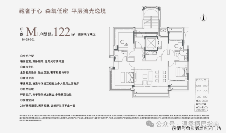 建面约122㎡的中叠四房,大平层式设计,宽尺横厅+阳台+270°主套飘窗采光条件极佳,每天早晨都被阳光晒醒。