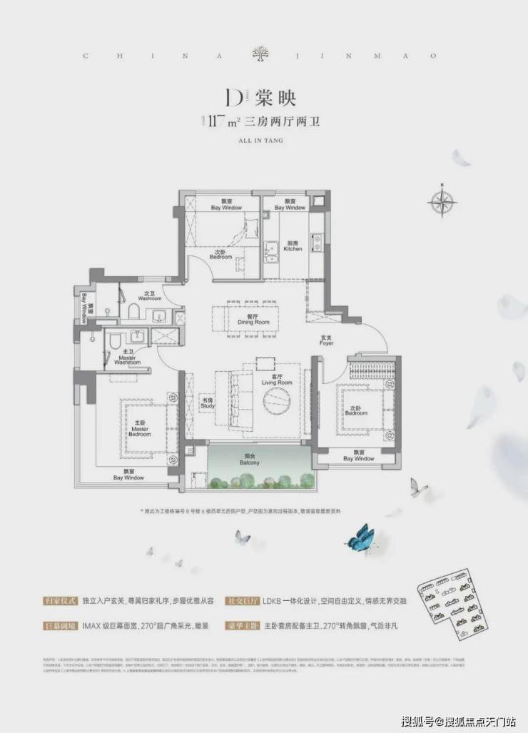 建面约117㎡3房2厅2卫,做到了3+1 开间朝南 + 5个飘窗 +主卧套房设计+270°转角飘窗,所有的尺度都有进一步提升。