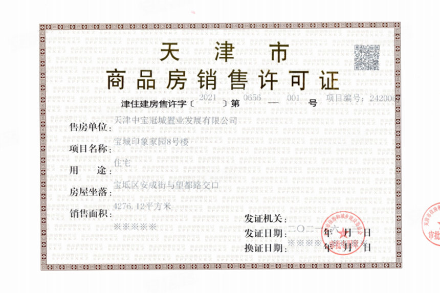 - 津住建房售许字[2021]第0656-001号 详情发证时间 2021-06-03绑定楼栋8#证件照片