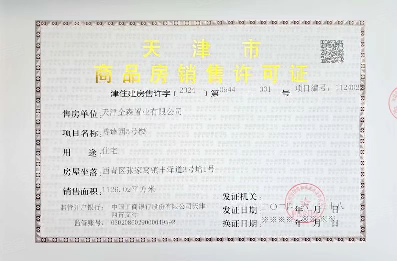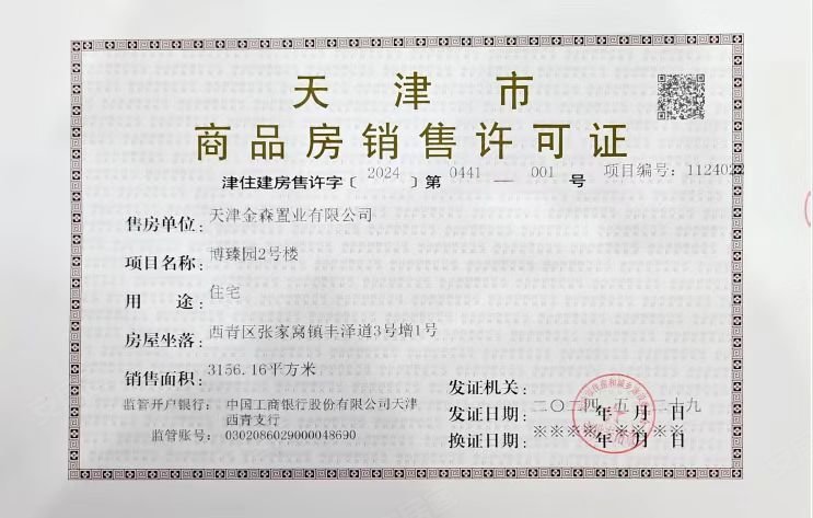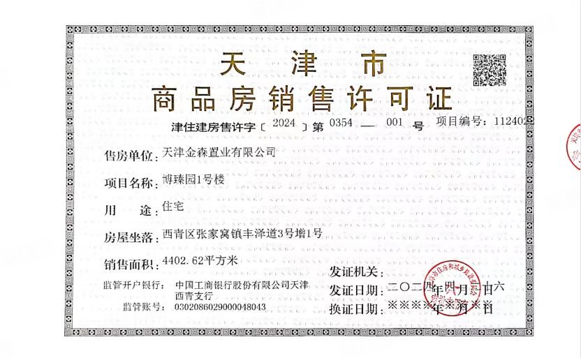 - 津住建房售许字〔2024〕第0441号 详情发证时间 2024-05-29绑定楼栋博臻园2号楼