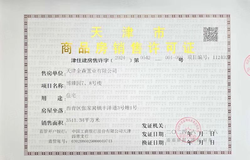 - 津住建房售许字【2024】第0542号 详情发证时间绑定楼栋7#、8#证件照片