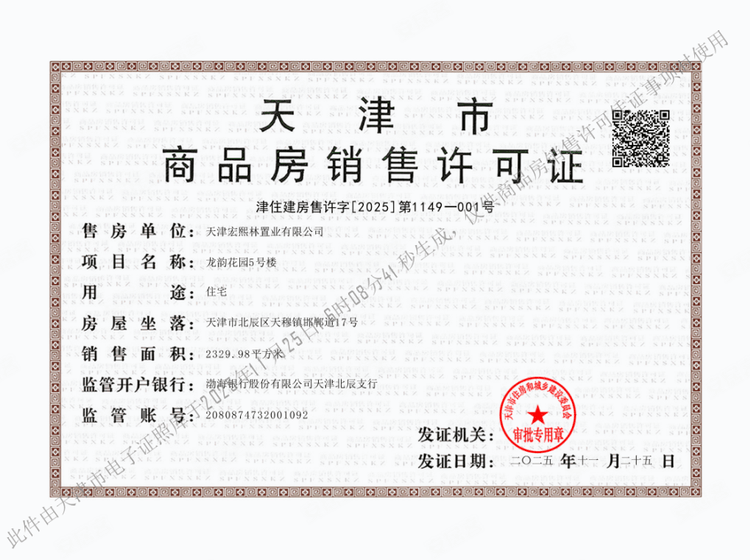 - 津住建房售许字【2025】第1149-001号 详情发证时间 2025-11-25绑定楼栋5#证件照片