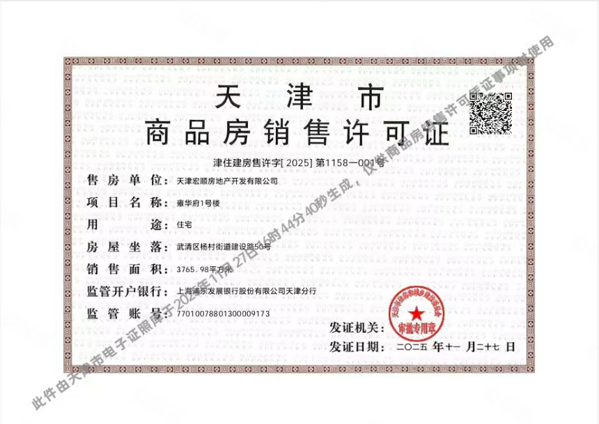 - 津住建房售许字【2025】第1158-001号 详情发证时间 2025-11-27绑定楼栋证件照片