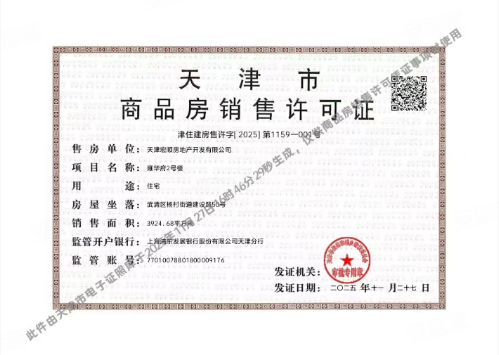 - 津住建房售许字【2025】第1159-001号 详情发证时间 2025-11-27绑定楼栋证件照片