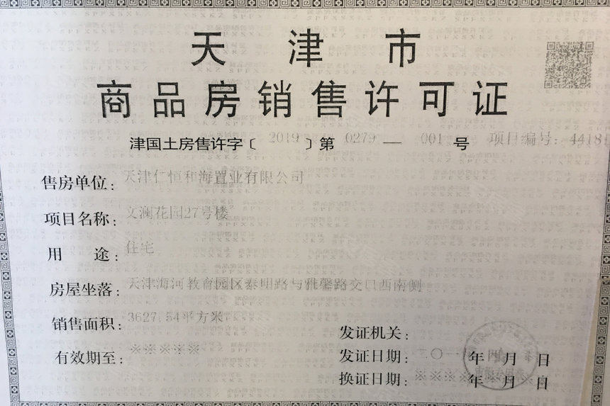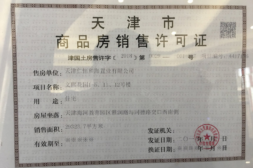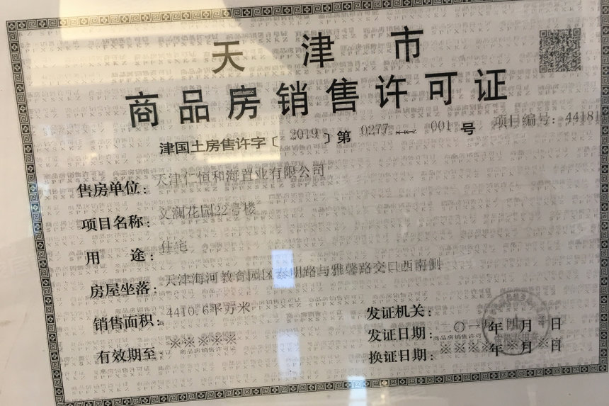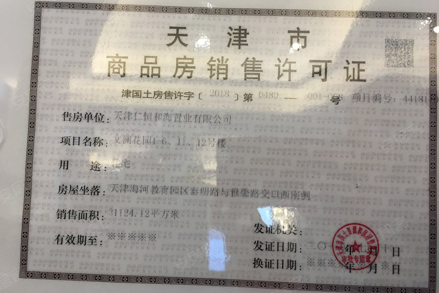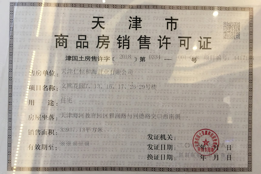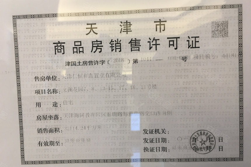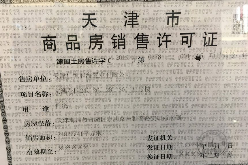 - 津国土房售许字[2018]第1044号 详情发证时间 2018-10-19绑定楼栋文澜花园7、8、13-15、17、18、21号楼证件照片