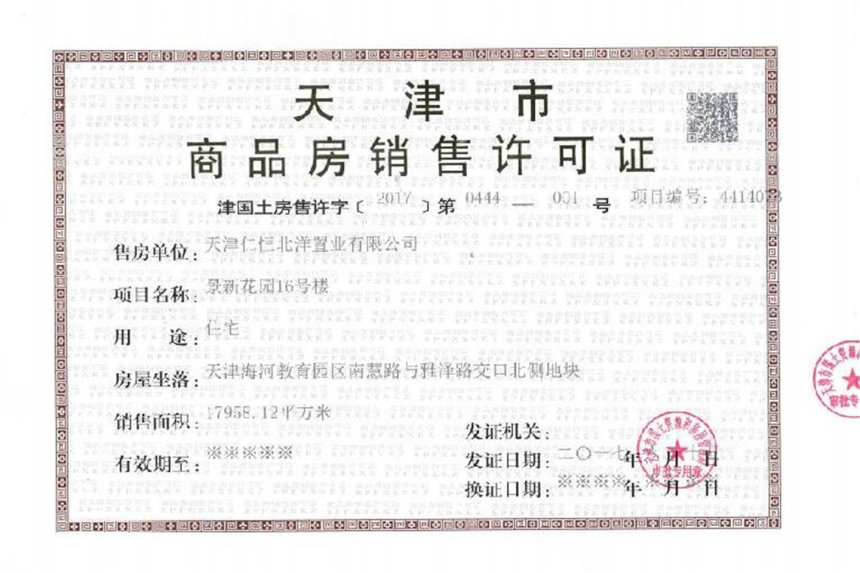 - 津国土房售许字[2017]第0444号 详情发证时间 2017-06-10绑定楼栋暂无证件照片