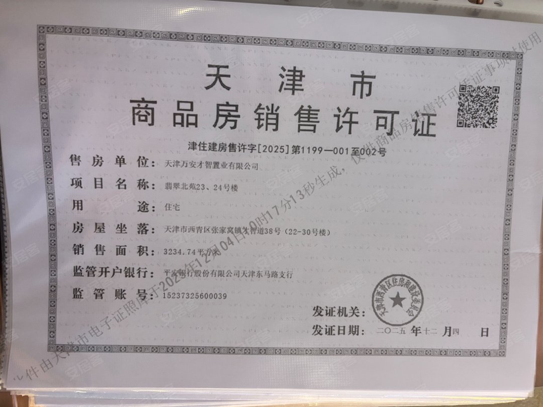 - 津住建房售许字2025第1199-001至002号 详情发证时间 2025-12-04绑定楼栋23#、24#证件照片