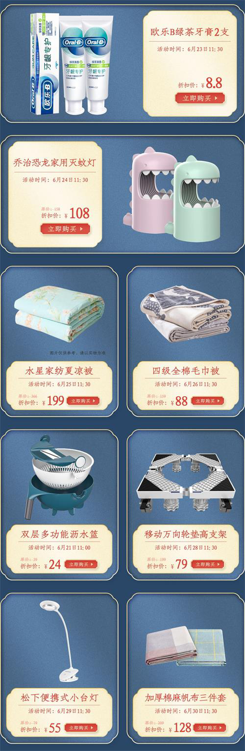 包含欧乐B绿茶牙膏、乔治恐龙家用灭蚊灯、水星家纺夏凉被、四级全棉毛巾被、松下便捷式小台灯等;