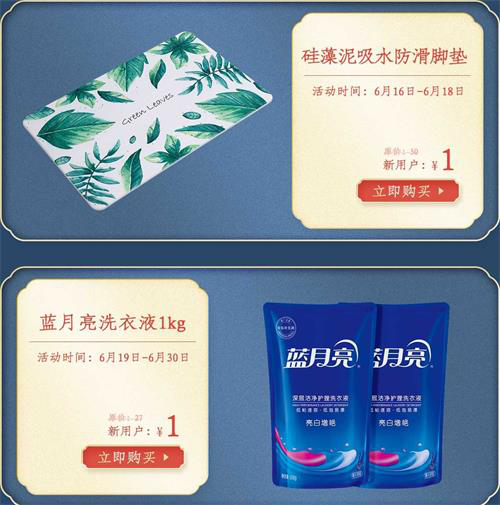凡是在活动期间,注册云树商城的新会员,即可马上参与新用户一元优惠福利,包含硅藻泥吸水防滑脚垫,蓝月亮洗衣液等;