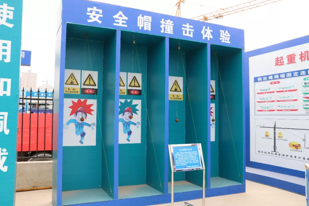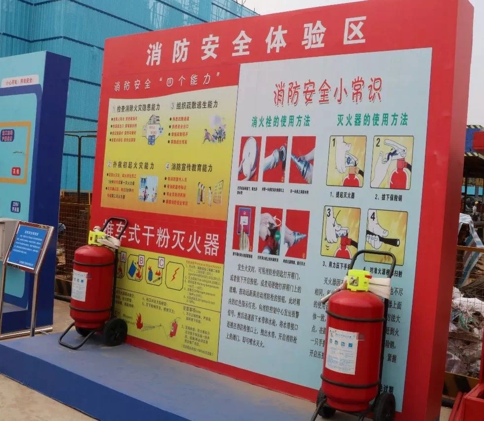 施工现场配备安全体验教学区,其中安全体验教学区体验项目种类齐全、形式多样。包括安全防护用品体验、安全帽冲击体验、综合用电体验、灭火器体验、综合消防用品展示、应急救援体验、密闭空间作业体验、安全带体验、钢梁行走体验、电焊作业体验、消防隐患排查体验等20余个体验项目。