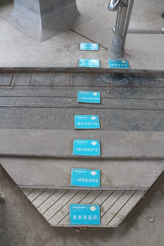 展示工艺:基层处理、层面保温、屋面找坡、防水找平层、SBS防水、防水保护层、屋面分隔缝、环氧地坪漆面层、屋面排气孔、烟风道出屋面、成品风帽、屋面透气孔、屋面天漏、女儿墙