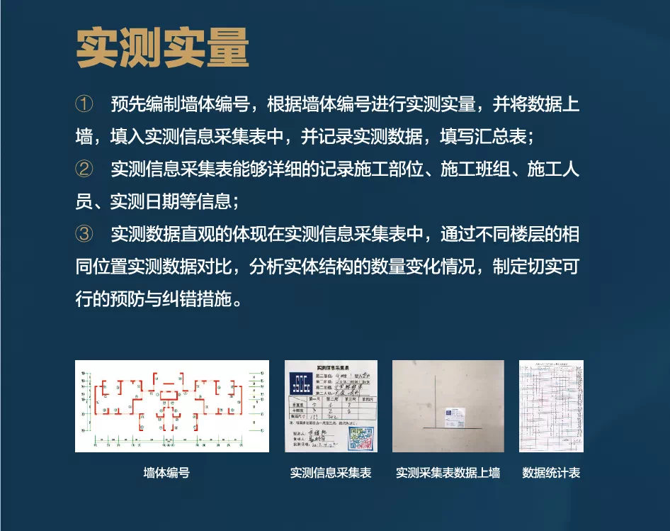 对每一栋楼的每一道墙体进行编号,然后对这些墙体进行平整度、垂直度进行实量,在模板支设之后,对模版进行测量,然后模板拆除后,对实体进行测量并录入。通过这些数据进行对比分析、进行纠偏,通过上述举措,我们能够有效的控制房间的垂直度、平整度和净尺寸。