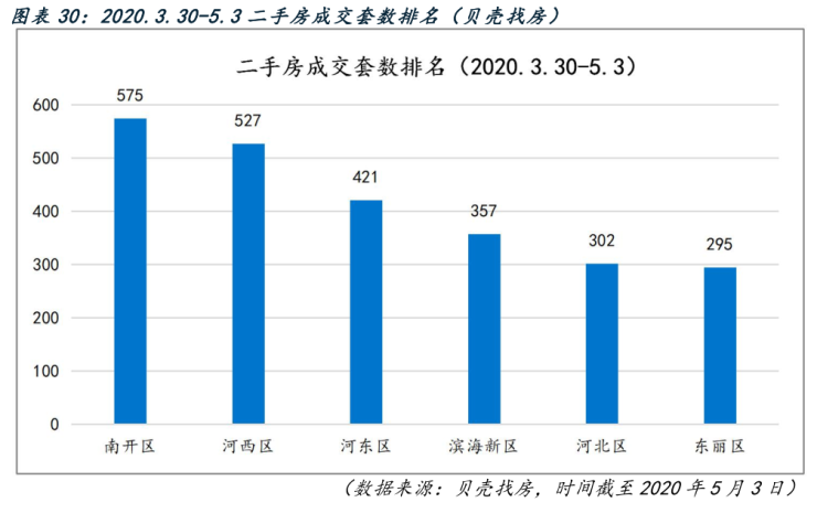 根据贝壳找房数据,从 3 月 30 日到 5 月 3 日,南开区成交 575 套二手房,排名排名前列河西区成交了 527 套,排名第二,河东区、滨海新区、河北区、东丽区成交量位列其后。