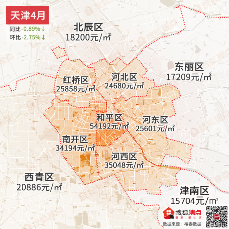 天津4月份二手房成交均价13141元/㎡,环比下跌0.35%。