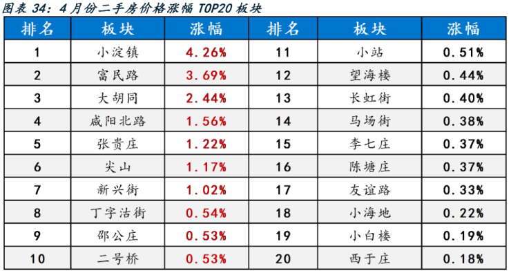 4 月涨幅较高的板块有:小淀镇、富民路、大胡同、咸阳北路、张贵庄、尖山、新兴街、丁字沽街、邵公庄、二号桥。