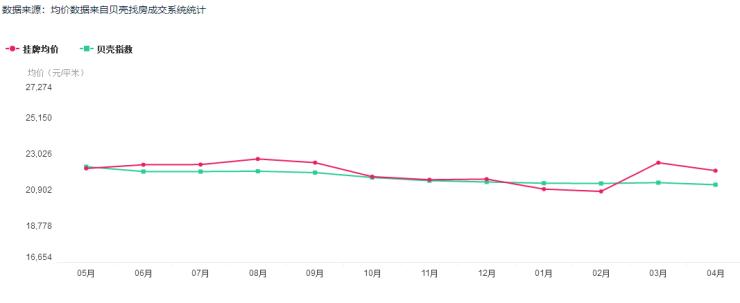 同时,4月挂牌均价为22038元㎡,相对于3月份(22509元/㎡)下跌2.1%,挂牌价格的下降,说明房东预期在下降。