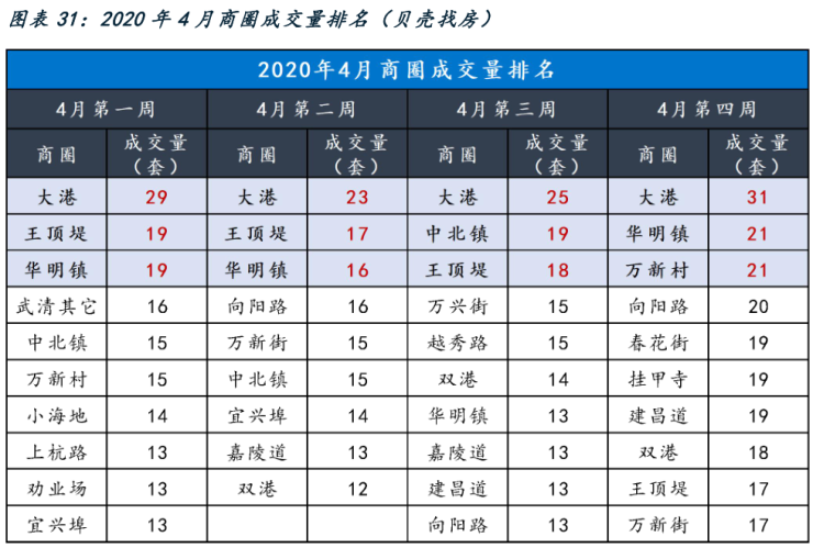 大港4月份每周都稳坐二手房成交量排名前列的宝座,总价20-30万的白菜价房源批量出货;其次,王顶堤、中北镇、华明镇、向阳路也是成交的大热门区域。