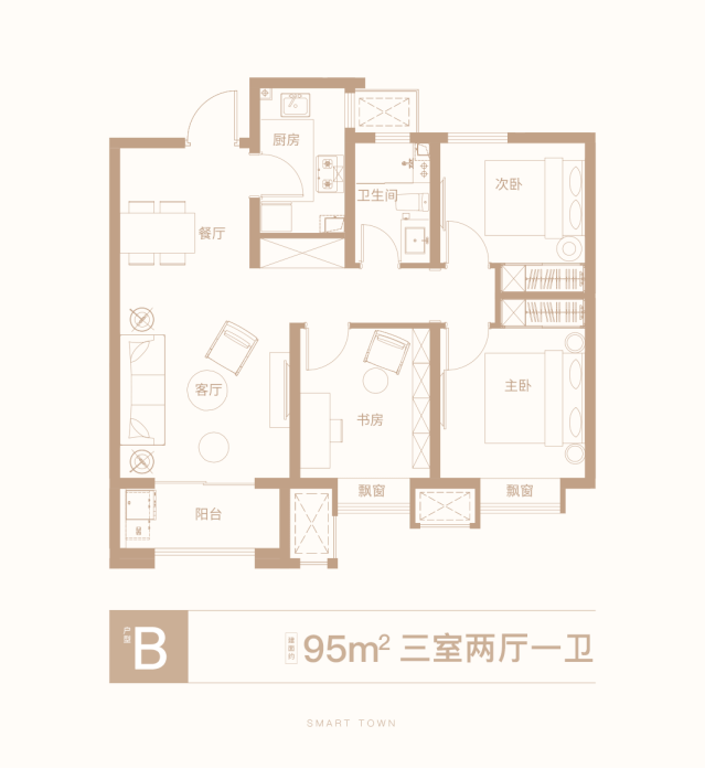 中核智慧城95㎡,在有限的空间中打造轻奢三室,在空间分割上更为灵活。南向次卧可安置为老人房、儿童房或装修成学习工作与迎接宾客的书房,满足多代家庭的生活与社交需求,再无宾客造访没房间的尴尬情况。