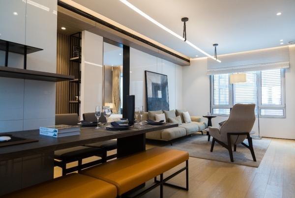 未来城117 m2户型采用U型厨房设计,它较传统的厨房相比将承载更大的储存容量、更流畅的操作动线、更宽敞的烹饪空间。同时,和客厅的相互承接,在提高空间利用率的基础上,也使得客厅、餐厅串联成一条直线,保证空气对流,享有微风穿堂而过。合理规划的餐客厅空间,给予家庭更开阔的空间享受,更敞亮的视线体验,同时兼顾实用与舒适,彰显尊贵与优雅。
