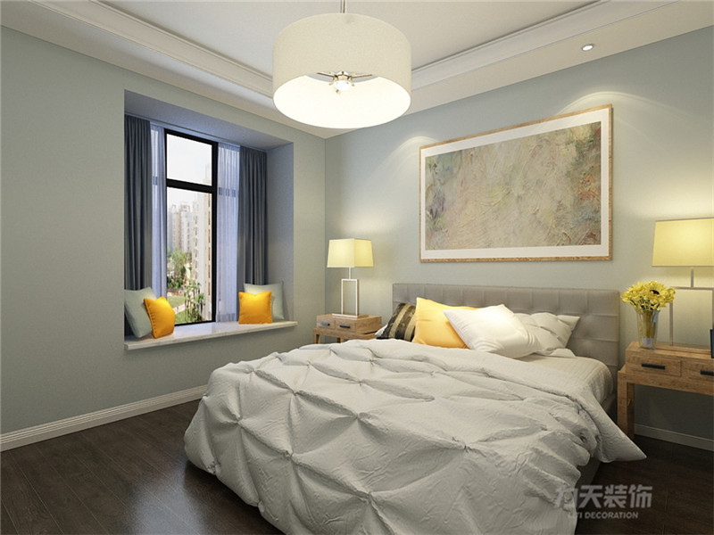 卧室整体的设计装饰,都是清新、柔软又放松的氛围,深色强化复合地板,脚感舒适,整体氛围也更稳重踏实。