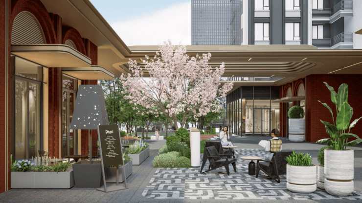 中轴景观带北向还与红房子文旅旗舰、囍悦里商业街相连,形成延续的慢行街区感觉