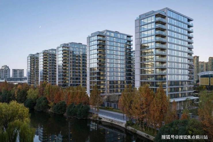 在正午的树影中,绿城·凤起潮鸣的建筑外立面是优雅的灰调;在夕光中,它又会被染成很有金属质感的暖色调;在晴朗的早晨,它才会回归到它原有的蓝调本色。