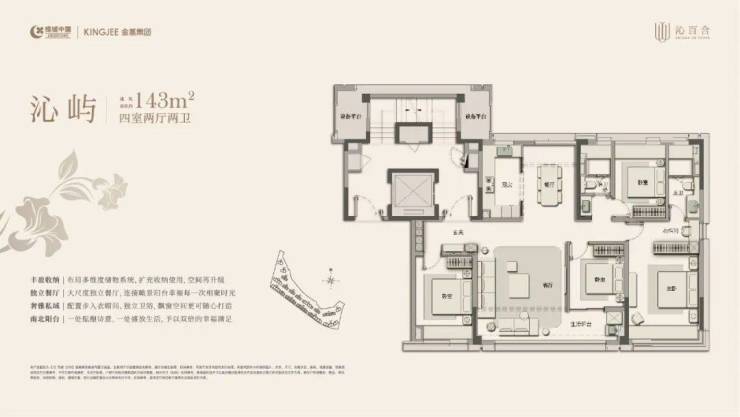 而沁百合建面约143㎡户型,则能媲美市面上170㎡以上的小高层。因此这个户型也就存在更多可能性,既可以做宽敞的四房,也可以做超大横厅。