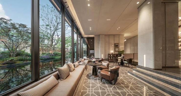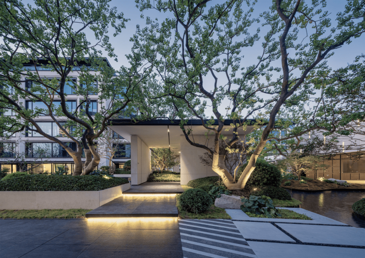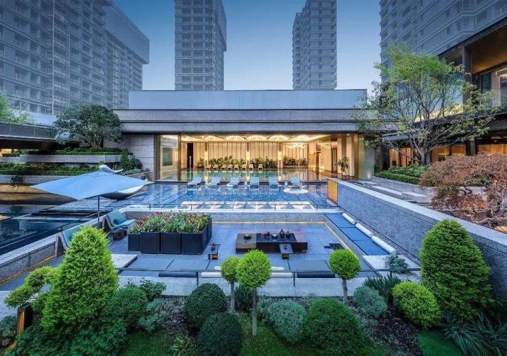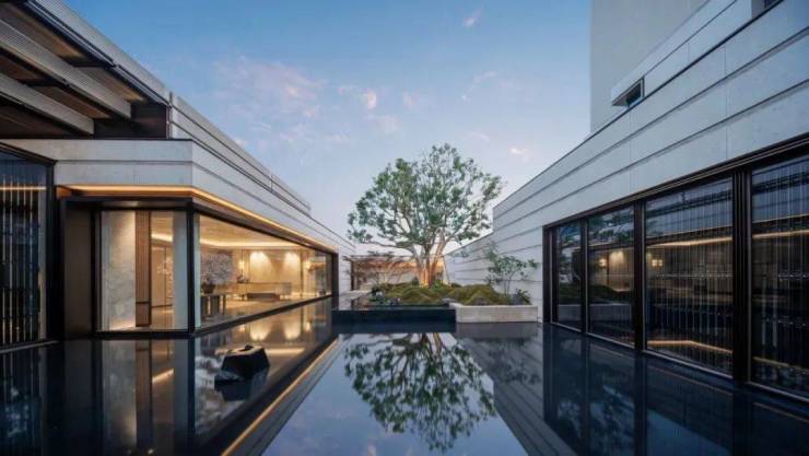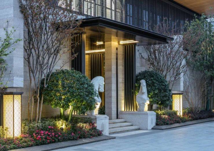 据说为了这个下沉式庭院,沁百合也是砸下巨大成本。选用的石材都是福建玄武黑石材、巴西海蓝宝奢石、意大利米黄洞石等这些名贵石材;中央近10米的铁冬青造价更是达到惊人的约60万,是景观设计师历时2个月才在广州深山里找到的。