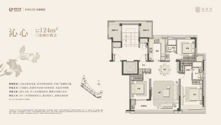 沁百合建面约124㎡三房两卫户型,基本就相当于市面上150㎡左右的小高层,无论客厅的开间,还是主卧、厨房的尺度都非常足。